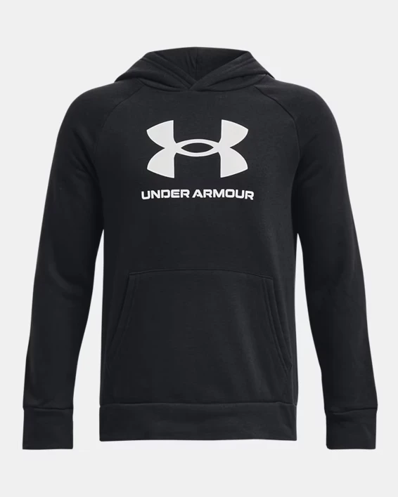 Chlapecká mikina UNDER ARMOUR Rival Fleece Big Logo - černáChlapecká mikina UNDER ARMOUR Rival Fleece Big Logo v černé barvě s kapucí. Mikina fleece je vyrobena z 80% bavlny , 20% polyester. Mikina UNDER ARMOUR je přes hlavu ve volném střihu. Vnitřní hladká strana materiálu Vás skvěle zahřeje, vnější je měkká na omak.  Nastavitelná překřížená kapuce. - Velmi měkká bavlněná směs fleece s kartáčovanou vnitřní stranou pro větší teplo- Přední klokaní kapsa- Žebrované manžety a spodní lem- Volné: Plnější střih pro naprosté pohodlí.- Materiál: 80% bavlna/20% polyesterUNDER ARMOUR