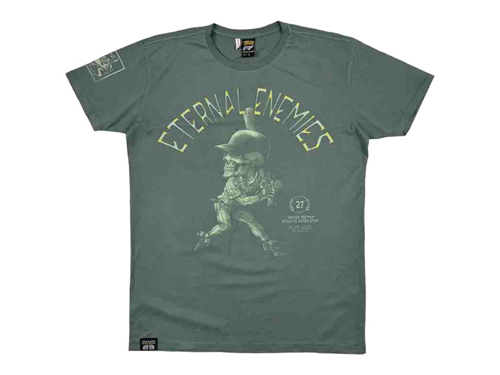 Tričko Yakuza Premium Eternal Enemies přináší neotřelou kombinaci sportovní estetiky a temného rebelství. Hlavní motiv na hrudi – skelet v baseballové výstroji připravený k odpalu – doplňuje nápis ETERNAL ENEMIES (Věční nepřátelé), který odkazuje na nekonečný souboj, soupeření a odmítání smíru. Zadní stranu zdobí nápis NATIONAL LEAGUE – ETERNAL ENEMIES s odkazem na „Athl. Association Los Angeles“, čímž tričko získává atmosféru temného undergroundového týmu.Kvůli střihu přiléhajícímu k tělu je tričko trochu těsnější, proto si v