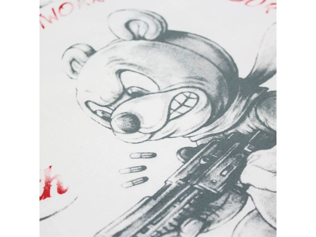 Pánské triko s krátkým rukávem Yakuza Premium Selection je skutečně jedinečné. Na přední straně dominuje výrazný potisk s motivem rozzlobeného medvídka s kulometem, doplněný nápisy Cut the Roots – Bad Guardians – Speed and Power – Glory. Design působí provokativně a symbolizuje vzdor, odhodlání a sílu. Zadní část trička zdobí nápis Pain & Gain – Fight & Glory – Bad Guardians, doplněný lebkou v čepici šaška, který podtrhuje surový a rebelský charakter trička.Kvůli střihu přiléhajícímu k tělu je tričko trochu těsnější, proto si v