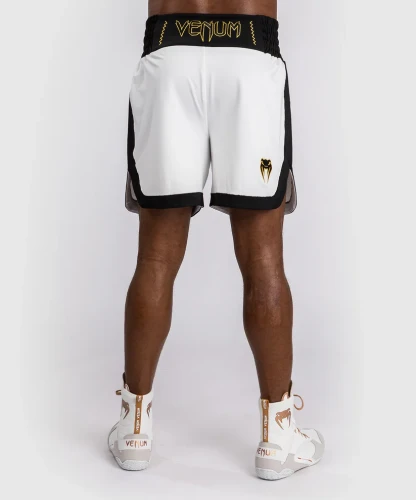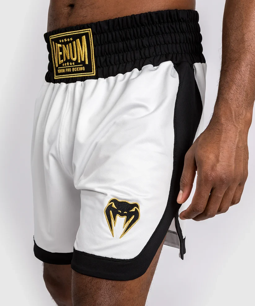 Pánské Boxerské šortky VENUM Classic - bílé/černoBoxerské šortky VENUM Classic! Pánské šortky VENUM určené na Box v bílo černé barvě. Navzdory tradičnímu střihu má uživatel mnoho výhod moderního designu. Tyto lehké boxerské šortky Venum mají tradiční široký pas a šňůrku pro bezpečné uchycení, takže se můžete soustředit na svůj výkon v ringu. Pružná tkanina a boční rozparky mezitím usnadňují plný rozsah pohybu. Na přední a zadní straně pasu a na levém stehně jsou vyšívaná loga Venum ve zlaté barvě.Vlastnosti produktu: - Materiál 1: 90 % polyester, 10 % elastan- Látka 2: 78 % polyester, 2 % elastan - Tradiční široký pás v pase pro větší oporu- Lehká a pružná tkanina- Ideální pro všechny úrovně- Sítotiskem vytištěné logo- Praní za studena (na 30 °C).- Perte s podobnými barvami - Nesušte v sušičce- Nebělit- Nežehlete.VENUM