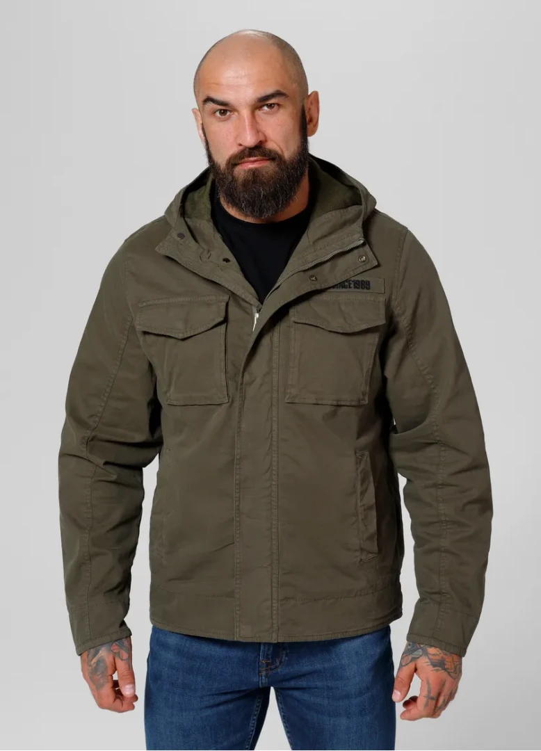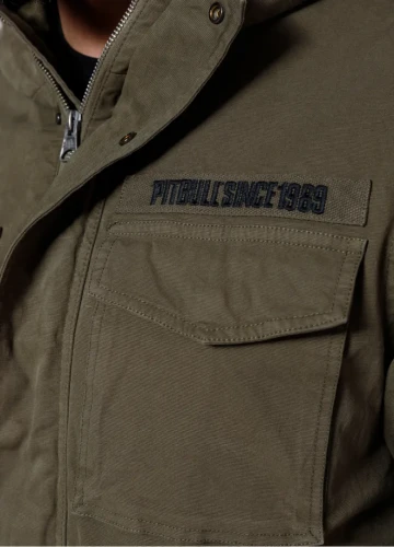 Pánská letní bunda Pitbull West Coast Fallon - olivová Bunda PitBull West Coast - Fallon má kratší vojenský střih. Pánská letní bunda Pitbull West Coast Fallon z vysoce kvalitní silné bavlněné tkaniny.- kratší vojenský střih- vyrobeno z vysoce kvalitní silné bavlněné tkaniny- látková podšívka- tkanina s lehkým pracím efektem- dvě otevřené kapsy na ruce - dvě další náprsní kapsy se zapínáním na patentku- zapínání na kovový zip skrytý za látkovou záložku s druky- integrovaná kapuce- odnímatelné manžety- vyšívaná nášivka Pitbull Since 1989 na hrudi- vyšívaná nášivka na levém rukávu- Materiálové složení: vnější látka - 98 % bavlna, 2 % elastan / podšívka - 100 % polyesterPitbull West Coast