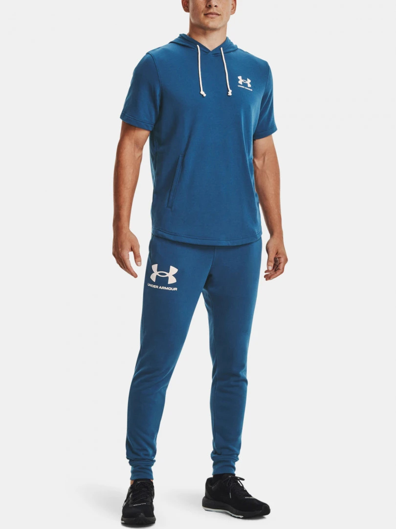 Pánské tepláky UNDER ARMOUR RIVAL TERRY JOGGER - modréPánské tepláky UNDER ARMOUR RIVAL TERRY JOGGER v modré barvě. Pánské volnočasové tepláky z francouzského „froté“ materiálu. Tento materiál ze směsi polyesteru a bavlny je velmi lehký a pohodlný. Skvělá volba pro každodenní nošení.- Froté materiál má hladkou vnější vrstvu a teplý, měkký vnitřek.- Materiál skvěle odvádí pot a velmi rychle schne.- Příjemný elastický pas s vnější stahovací šňůrkou.- Otevřené kapsy na ruce.- Délka nohavic od rozkroku: 77,5 cm.- Střih se zúženými nohavicemi.UNDER ARMOUR