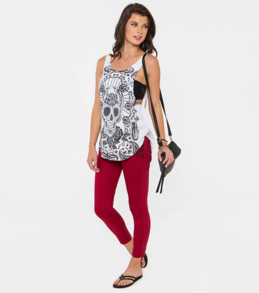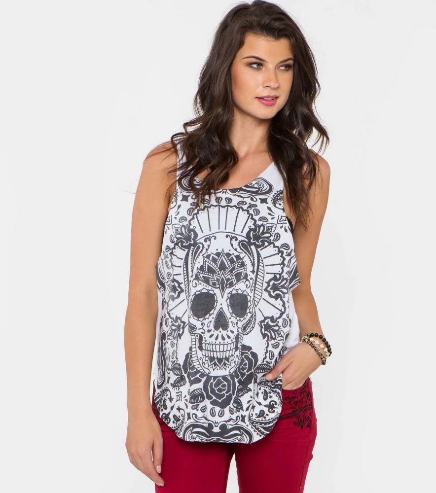 Dámske tielko ADVENTUROUS v bielej farbe. Tielko Metal Mulisha je ľahko elastické s prednou potlačou. Tielko má design v štýle mexických sviatkov dušičiek.