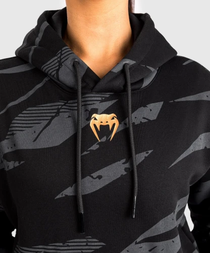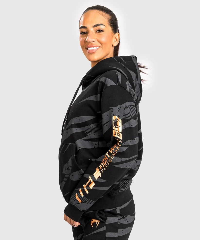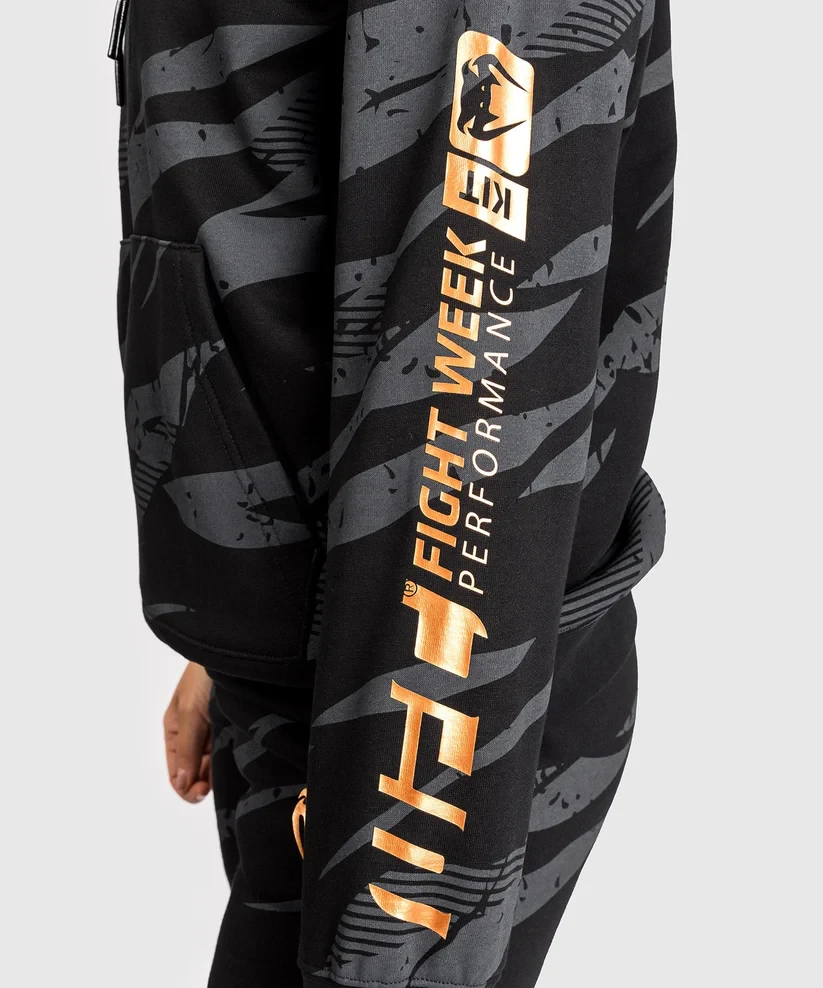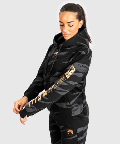 Dámská mikina UFC Adrenaline by Venum Fight Week - urban camoKolekce UFC Adrenaline by Venum se vyznačuje odolnými výkonnými materiály a promyšlenými detaily. Dámská mikina s kapucí UFC Adrenaline by Venum Fight Week v barvě Urban Camo má na hrudi, rameni a po celé délce levého ramene bronzové detaily loga Venum a UFC. Přední kapsa ve stylu klokanky a kapuce se stahovací šňůrkou. - Tkanina: Materiál: 55 % bavlna, 45 % polyester- Pravidelný střih- Podšívka ze síťoviny na kapuci- Kapuce s nastavitelnými šňůrkami- Přední klokaní kapsa- Sítotisková loga- Praní v chladu / 30 °C.- Nesušit v sušičce- Nežehlit.Venum