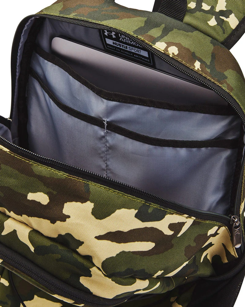 Sportovní batoh UNDER ARMOUR HUSTLE SPORT BACKPACK - zelenýSportovní batoh UNDER ARMOUR HUSTLE SPORT BACKPACK v zelené barvě. Povrchová úprava UA Storm zajišťuje vysokou odolnost proti vodě a znečištění. Ramenní popruhy se systémem LEVELED pro jednoduché nastavení vyváženého rozložení hmotnosti.- Prodyšný síťovaný zádový panel pro lepší komfort a odolný spodní panel s PU povrchem.- Vnitřní kapsa s měkkou podšívkou pro uložení až 15 notebooku.- Přední stahovací kapsa pro snadné uložení bundy, bot nebo míče- Velká přední kapsa se zipem pro uložení cenností.- Odolný spodní panel s povrchovou úpravou proti odření.- 2 boční kapsy na láhev vody- Horní držadlo.- Rozměry: š 32 cm x v 19 cm x d 47 cm- Objem: 26 l.UNDER ARMOUR