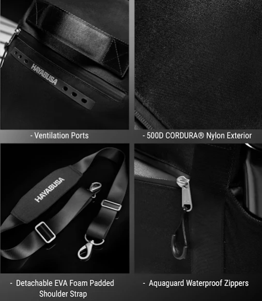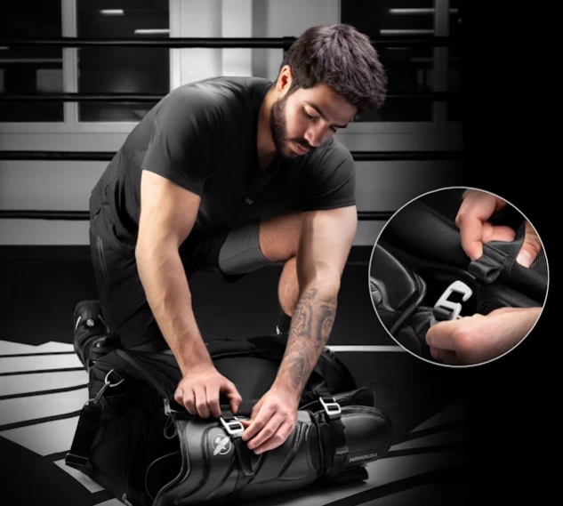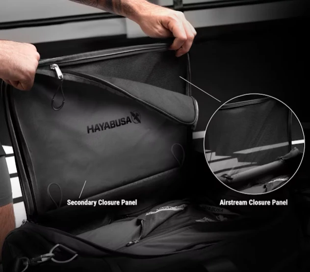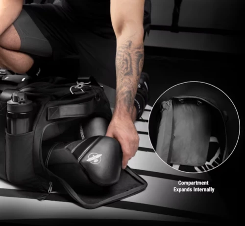 Rozšiřitelná boční přihrádka je ideální pro uložení vlhkých boxerských rukavic, bot nebo propoceného oblečení. Tuto přihrádku lze úhledně složit a zajistit, aby bylo v hlavní přihrádce více místa.