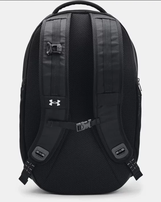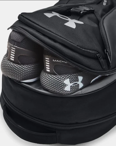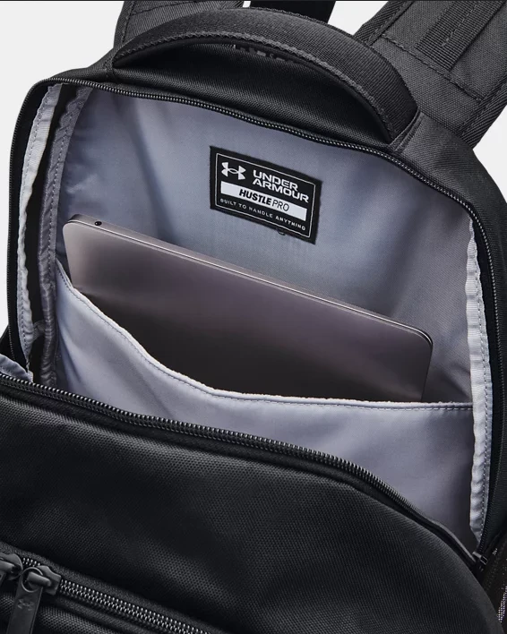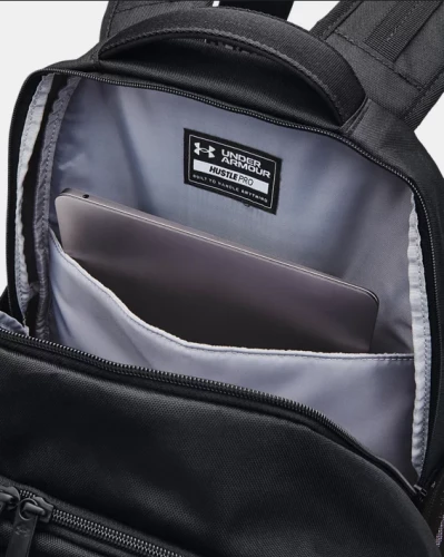 Sportovní batoh UNDER ARMOUR Hustle Pro Backpack - černýSportovní batoh UNDER ARMOUR Hustle Pro Backpack v černé barvě. Povrchová úprava UA Storm zajišťuje vysokou odolnost proti vodě a znečištění. Ramenní popruhy se systémem LEVELED pro jednoduché nastavení vyváženého rozložení hmotnosti.- Prodyšný síťovaný zádový panel pro lepší komfort a odolný spodní panel s PU povrchem.- Vnitřní kapsa s měkkou podšívkou pro uložení až 15 notebooku.- Izolovaná kapsa, kapsa s jemnou podšívkou pro uložení cenností, organizační kapsy a přední kapsa se zapínáním na přezku.- Velká kapsa na použité prádlo nebo boty se zapínáním na zip.- Nastavitelná, odnímatelná spona UA Strap Clip na rameni.- Strap Clip funguje nejlépe při sepnutí hrudního pásku.- 2 boční kapsy na láhev vody.- Na přední straně elastické popruhy pro flexibilní uchycení dalších věcí.- Rozměry: š 22,5 cm x v 51 cm x d 32 cm.- Objem: 31,5 l.UNDER ARMOUR