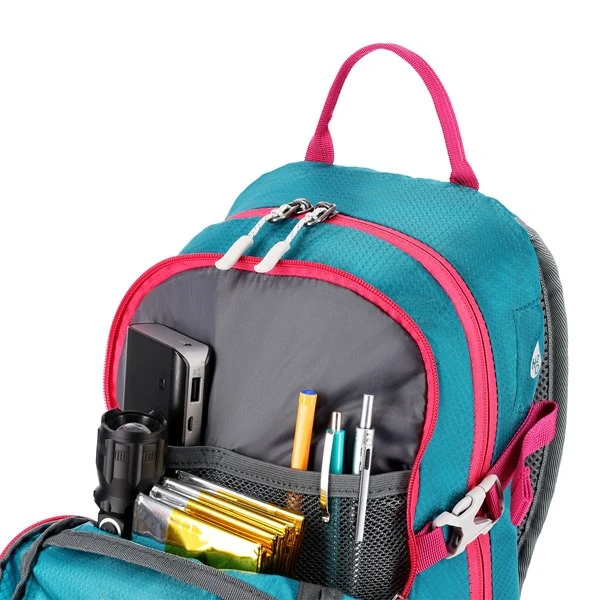 Na přezce hrudního popruhu je umístěna integrovaná záchranná píšťalka pro větší bezpečnost v nouzových situacích. Batoh dále nabízí další panel s úchyty na různé příslušenství, dvě boční síťované kapsy a kapsy na zip v bederním pásu, ideální pro uložení telefonu nebo jiných drobností.