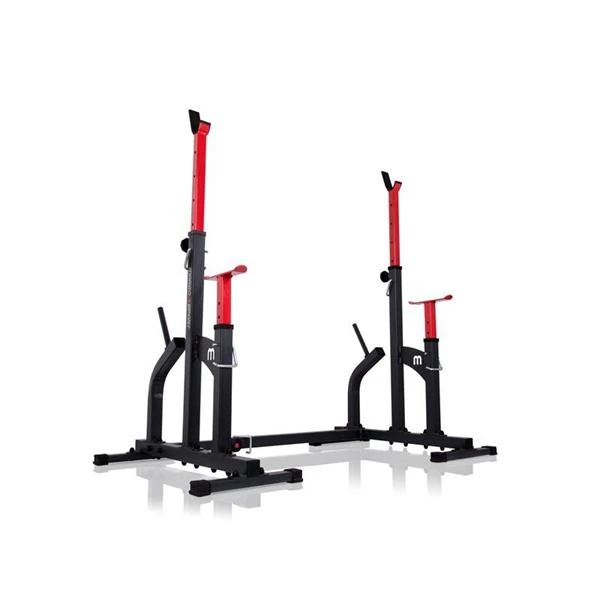 Kombinované stojany s jištěním známé značky MARBO MS-S104. Stojany jsou vyrobeny z velmi kvalitní oceli. Profil konstrukce je 50x50x2mm. Výšku lze nastavit do 8 stupňů a jištění do 6 stupňů.Navíc díky tří stupňové regulaci šířky tohoto zařízení, ideálně dopasujete délku Vaší činky. Maximální zátěž na stojan je 350kg.