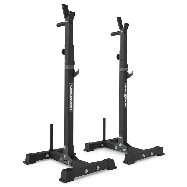Stojany pod velkou činku se zarážkami MARBO Sport MS-S108 ve verzi 2.0 jsou vyrobeny na precizních CNC strojích z ocelových profilů o rozměru 50 x 50 x 2 milimetry, tento postup výroby zaručuje vysokou přesnost a stabilitu konstrukce spolu s nosností 300 kilogramů. Výšku stojanů je možné nastavit po 5-ti centimetrových krocích do 13-ti úrovní v rozsahu od 103 do 163 centimetrů. Základna o rozměru 54 x 45 centimetrů se dále stabilizuje nevyužitým závažím, které se nasadí na odkládací trny o rozměru 21 x 2,5 cm. Pokud jsou stojany MS-S108 2.0 dostatečně zatížené, tak je můžeme využít také jako stojany pro trénink dipů (kliků na bradlech), k tomuto účelu jsou stojany osazené madly s gumovými gripy. Pro maximální bezpečnost během silových tréninků jsou čepy pro nastavená výšky stojanů spojeny s rozměrným hákem, který lze umístit do 3 úrovní a primárně slouží k odhození činky, pokud již nemáte dostatek sil k vytažení činky do stojanu. Koncovky základny jsou vyrobeny ze speciální směsi gumy, která zajišťuje ještě lepší stabilitu a ochranu podlahy než u předchozí generace stojanů.