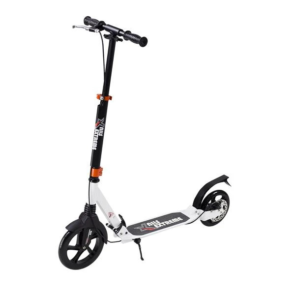 Skládací koloběžka značky NILS EXTREME HA230T je koloběžka určená pro celou rodinu. Charakteristickou vlastností koloběžky jsou dva tlumiče – přední svislý a zadní vodorovný, zajišťující větší komfort během jízdy, minimalizují drncání a pohlcují otřesy. Díky tomu se produkt dobře osvědčí při přejíždění nerovných povrchů. Široký a dlouhý nášlap je pokrytý protiskluzovým gripem zajišťujícím správnou přilnavost boty. Nastavitelná řídítka (až do výše 106 cm) umožňují přizpůsobit koloběžku k výšce dítěte nebo také zajišťují pohodlnou jízdu dospělým osobám. Mimo to má koloběžka 2 rozdílné velikosti koleček a to přední 230 mm a zadní 200 mm.