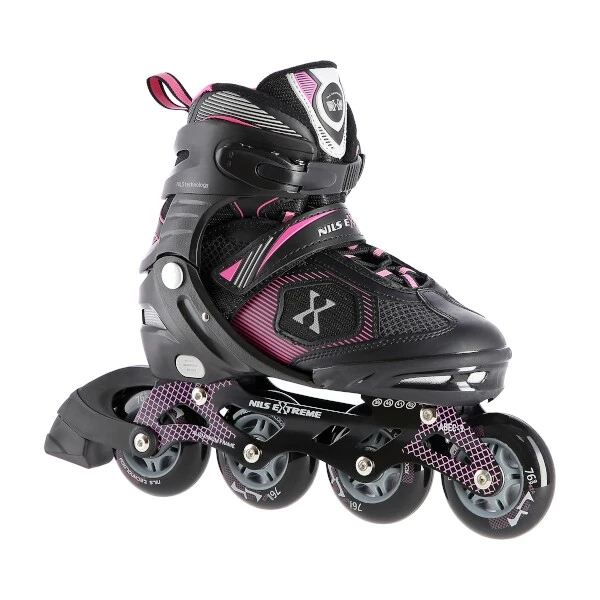 Kolečkové brusle NILS Extreme NA9080 jsou určeny k rekreační jízdě začínajících a mírně pokročilých bruslařů po rovných a hladkých stezkách, jako například po asfaltu. Lehká a odolná bota zajišťuje bezpečnost při jízdě. Systém ventilace a tvarovaná stélka boty přímo ovlivňují zvýšení uživatelského komfortu. Jedná se o model s nastavitelnou velikostí, kdy každá brusle má na výběr ze 4 rozměrů. Pomocí jednoduchého řídicího systému lze snadno a rychle nastavit velikost boty na noze uživatele. Kolečka s tvrdostí 82A jsou uložena v hliníkové liště, dobře přiléhají k podkladu a částečně pohlcují nervnosti. Model NA9080 je osazen ložisky ABEC 9, která se vyznačují precizním zpracováním a nízkým odporem, kdy jízda má dobrou setrvačnost a na bruslích tak lze urazit dlouhou vzdálenost bez vynaložení zbytečné síly.