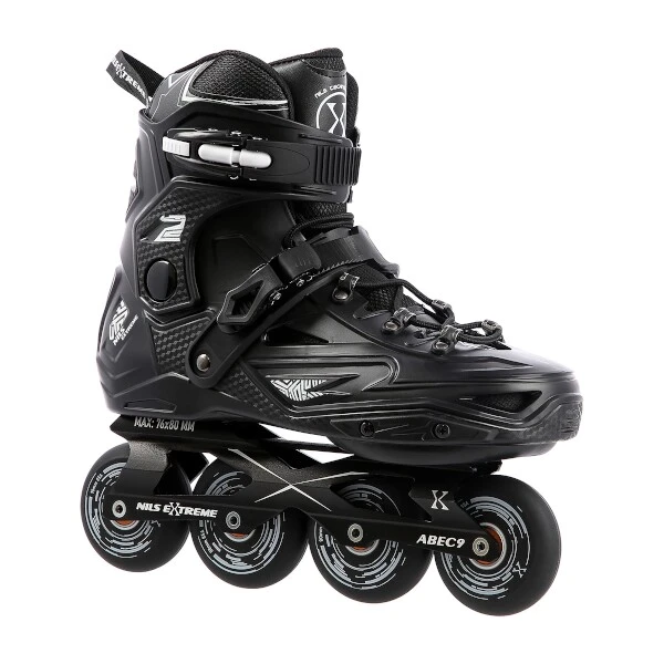 Kolečkové brusle NILS Extreme NA9786 jsou určeny primárně pro freeride a slalom. Jejich konstrukce je založena na lehké, větrané botě s anatomickou stélkou zaručující vysokou stabilitu paty, polypropylenovém skeletu a hliníkové liště vyrobené pomocí precizní CNC technologie. Jako zapínání bylo použito šněrování, dvojsekční přezky a kvalitní spony s napínacím mechanismem. Na vnější straně boty nalezneme slider, tak často užívaný při freeridu.