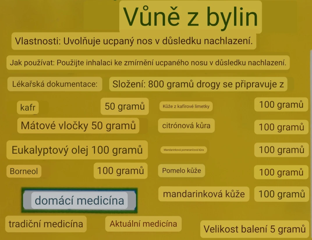 <h1>Bylinný inhalátor Bowdaeng brand formula 2</h1> <p>Bylinný inhalátor Bowdaeng Brand Formula 2 je tradiční thajský aromaterapeutický produkt navržený pro okamžité osvěžení a pocit volného dýchání.</p> <p>Je ideální během dne, cestování nebo při pocitu únavy a ucpaných nosních cestách.</p> <h2>Proč si ho oblíbíte</h2> <ul> <li>Přináší příjemné osvěžení při inhalaci aromatických látek.</li> <li>Obsahuje vyváženou směs bylin a esenciálních olejů.</li> <li>Kompletní aroma zážitek z mentolu a eukalyptu.</li> <li>Praktické malé balení vhodné pro tašku nebo kapsu.</li> <li>Snadné použití kdykoliv během dne.</li> </ul> <h2>Pro koho je vhodný</h2> <p>Inhalátor je vhodný pro dospělé, kteří hledají přírodní aromaterapeutický produkt pro osvěžení a pocit volného dýchání během dne – například při cestování, práci nebo pobytu venku.</p> <h2>Jak produkt používat</h2> <ul> <li>Otevřete kryt inhalátoru.</li> <li>Přiložte inhalátor k nosu a opatrně vdechujte bylinnou vůni.</li> <li>P5ičichněte podle potřeby během dne pro pocit svěžesti.</li> </ul> <h2>Složení a charakter produktu</h2> <p>Formula 2 obsahuje směs bylin a esenciálních olejů jako kafr, mátové vločky, eukalyptový olej, borneol a citrusové slupky (např. grapefruit), které vytvářejí výrazné a osvěžující aroma.</p> <h2>Co říkají zákazníci</h2> <p>Uživatelé hodnotí Bowdaeng Brand Formula 2 jako silný inhalátor s intenzivní vůní, který rychle osvěží a je oblíben při ucpaném nosu nebo únavě během dne.</p> <h2>FAQ – Nejčastější dotazy</h2> <h3>Pro koho je inhalátor vhodný?</h3> <p>Pro dospělé, kteří chtějí aromaterapeutické osvěžení a pocit volného dýchání během dne.</p> <h3>Jak často ho mohu používat?</h3> <p>Inhalátor lze používat podle potřeby během dne pro pocit svěžesti.</p> <h3>Je vhodný pro děti?</h3> <p>Produkt je primárně určen pro dospělé. Nebyly zaznamenány nežádoucí účinky, ale použití u dětí nedoporučujeme.</p> <h3>Má silnou vůni?</h3> <p>Ano, díky obsahu bylin a esenciálních olejů má výrazné a osvěžující aroma.</p> <h3>Lze ho mít stále u sebe?</h3> <p>Ano, jeho kompaktní balení je ideální na cesty nebo do kapsy.</p> <h3>Je vhodný při práci nebo cestování?</h3> <p>Ano, pohodlně se používá kdykoliv během dne, například během cestování či při práci.</p> <h2>Tip od ThaiProducts.cz</h2> <p>Bylinné inhalátory mají odlišné složení, proto doporučujeme vyzkoušet více druhů a najít ten, který vám vyhovuje nejvíce.</p> <h2>Upozornění</h2> <ul> <li>Pouze k aromatickému použití.</li> <li>Nejedná se o léčivý přípravek.</li> <li>Nevhodné pro děti do 6 let.</li> <li>Uchovávejte mimo dosah dětí.</li> <li>Nepolykejte.</li> <li>Zabraňte kontaktu s očima a sliznicemi.</li> <li>Nepoužívejte při přecitlivělosti na některou ze složek.</li> <li>V případě podráždění přestaňte ihned používat.</li> </ul> <h2>Klíčová slova</h2> <p>bylinný inhalátor, thajský inhalátor, aromaterapie, menthol, eukalyptus, kafr, osvěžení dýchání, Bowdaeng Brand, Formula 2, aromatický inhalátor, čichátko, ňufátko.</p>