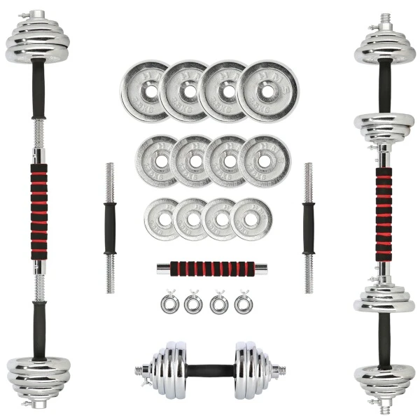 Speciální spojovací díl je po stranách opatřen závity, do nichž se jednoduše všroubují obě činky, toto řešení šetří náklady a místo ve Vaší domácí posilovně. Sada obsahuje 2 krátké, nakládací osy opatřené ergonomickým úchopem, spojovací díl, 4 zámky a 12 kotoučů.