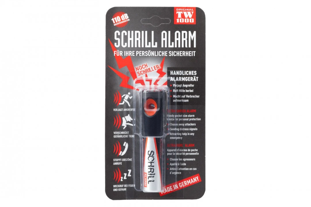 TW1000 Shrill Alarm je kapesní poplašné zařízení, které vydává extrémně hlasitý a pronikavý vysokofrekvenční zvuk o síle 110 dB.