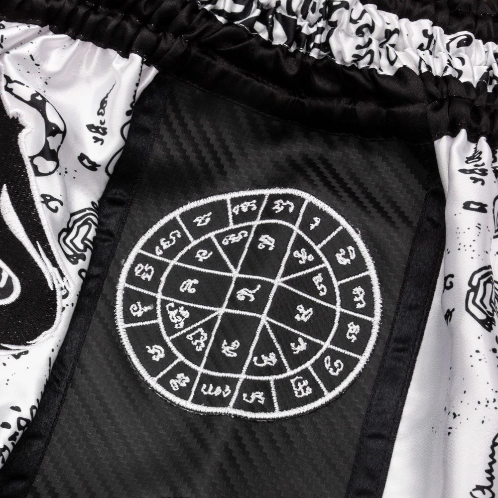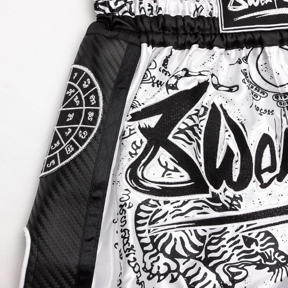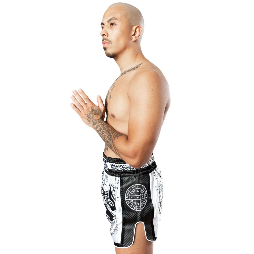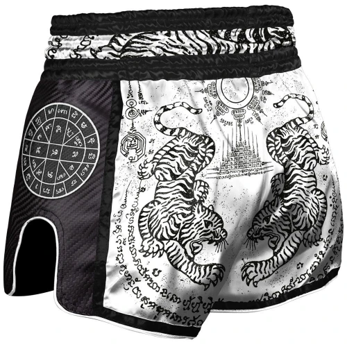 Carbonová látka po stranách a vysoké rozparky umožňují bez problému provádět všechny techniky kopů. Nízký pas velmi pohodlně sedí na těle a drží šortky bez přetáčení, nebo padání. Moderní design v thajském stylu je doplněn několika nášivkami.