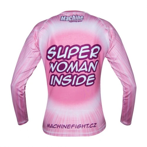 Dámský Rashguard MACHINE Super Woman dl. rukávDámský Rashguard MACHINE Super Woman dl. rukáv v růžové barvě. Dámský rashguard MACHINE je vyroben z moderního materiálu, který vylučuje pot/vlhkost a udržuje svalstvo zahřáté. Rashguard má na zadní straně logo SUPER WOMAN INSIDE!!!MACHINE