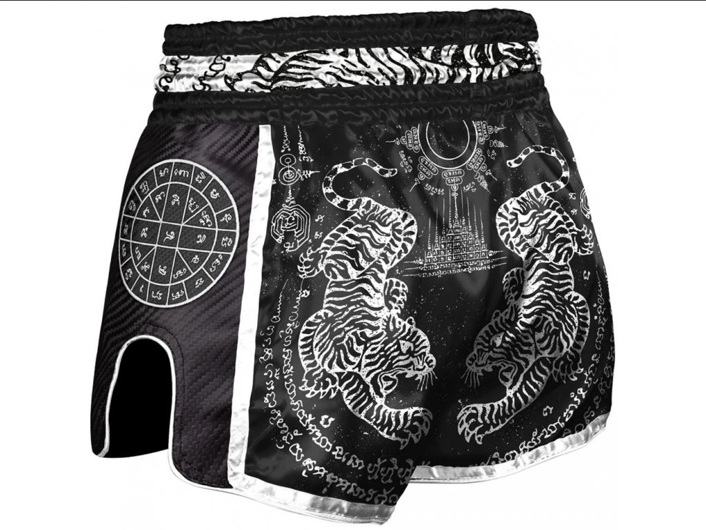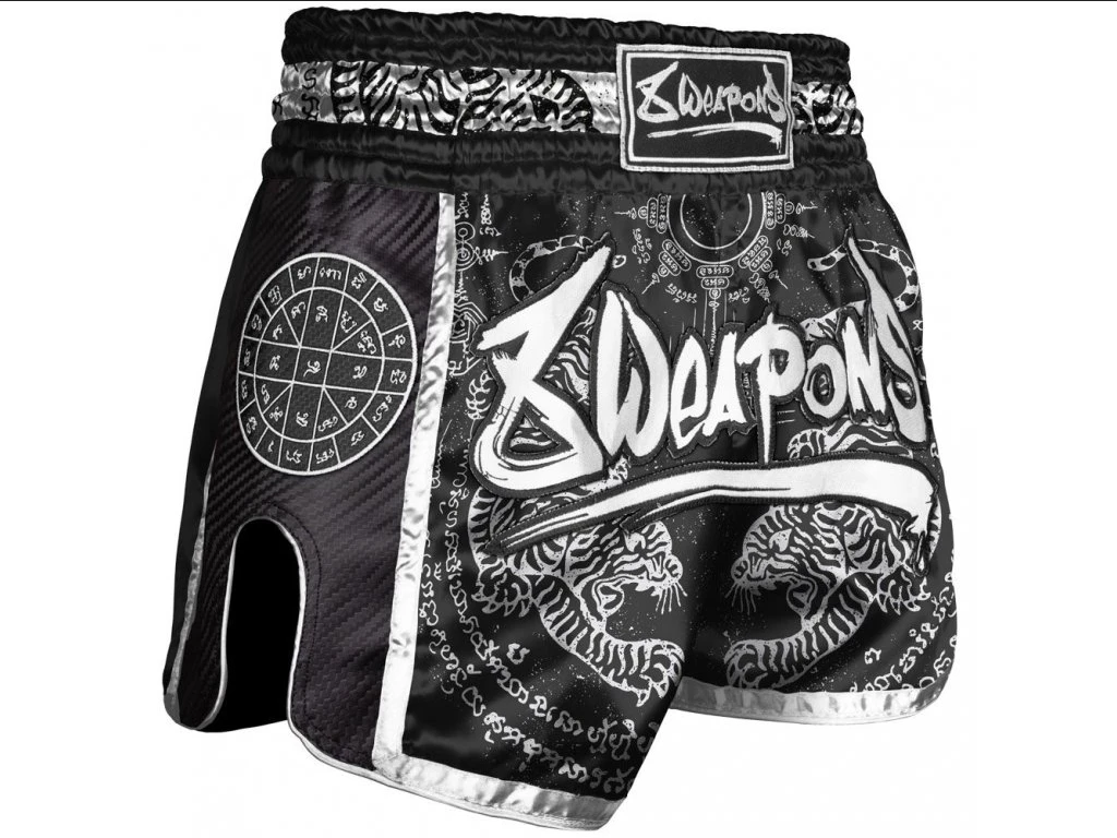 8 WEAPONS Muay Thai trenýrky Carbon - SAK YANT TIGERS - černo/bílé