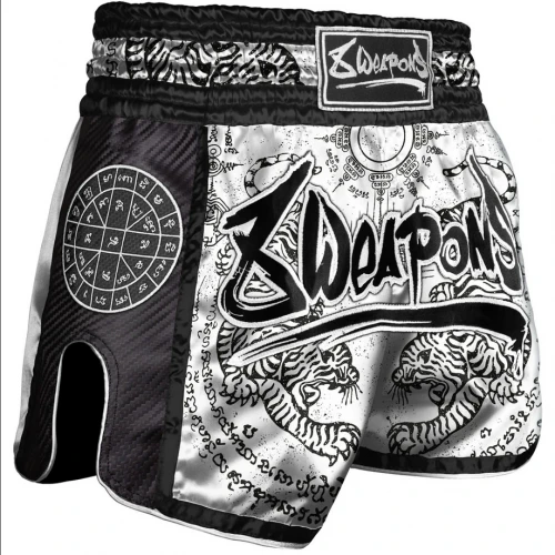 8 WEAPONS Muay Thai trenýrky Carbon, Sak Yant Tigers - bíléŠortky 8 WEAPONS Muay Sak Yant Tigers jsou šortky pro thaibox s novým moderním střihem. Tyto šortky na Muay Thai jsou vyrobeny z kvalitního saténu a drží pohromadě díky velmi spolehlivým švům. Boční strana kraťasů je vyrobena z karbonové tkaniny a nabízí skvělý pocit při nošení. Vysoký střih na boku vám poskytne dokonalý pocit při provádění kopů a kolen. Kraťasy jsou zakončeny velkou nášivkou s logem na přední straně a několika dalšími nášivkami po obvodu kraťasů. Vyrobené v jedné z nejlepších dílen v Thajsku!Vlastnosti prosuktu:- Velmi pružný pas pro stabilní střih- Široce střižené nohavice pro dokonalý rozsah pohybu- Vysoce kvalitní saténová tkanina- Dvojité prošití- Záplaty na přední straně a na bocích- Praní pouze naruby a maximálně na 30 stupňůDoporučená velikost 8 WEAPONS:50-69 KG - velikost M70-89 KG - velikost L90-105 KG - velikost XL106-115 KG - velikost XXL8 WEAPONS