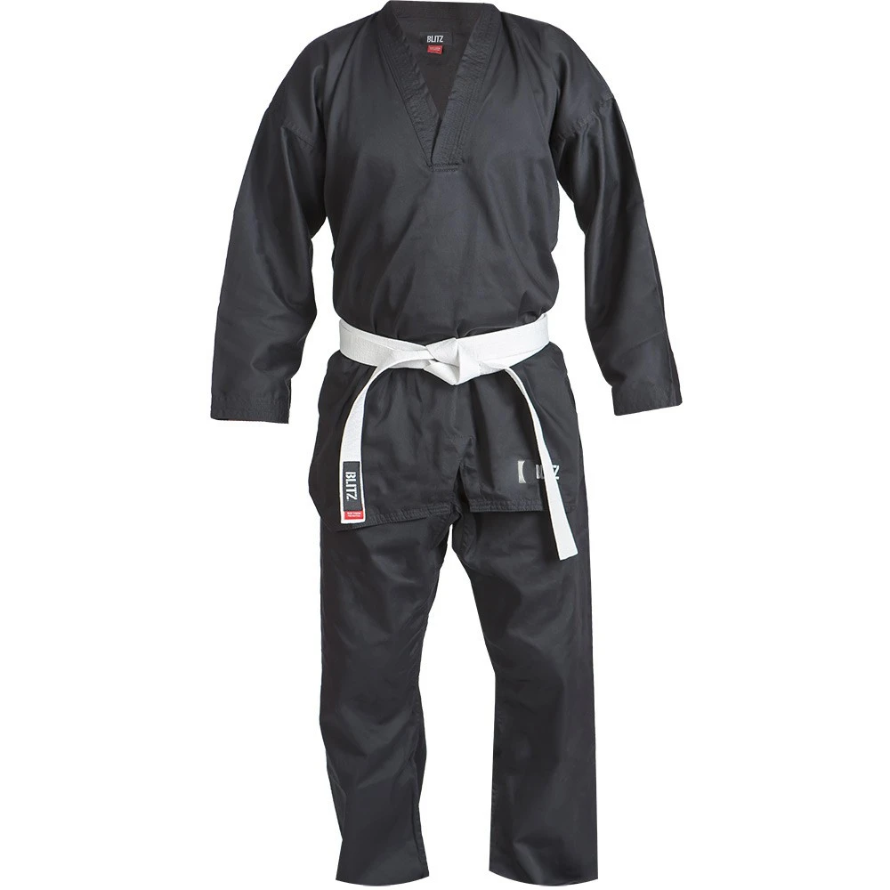 Dětské Kimono Plain V-Neck - černéDětské Kimono na Karate Plain V-Neck v černé barvě. Kimono na karate je hladké, měkké a příjemné na dotek. Kimono Plain V-Neck je vyrobené z 65 % polyesteru a 35 % bavlny. Bunda na karate je elastická a kalhoty na karate mají elastický pas. Tyto manžety a lem kalhot mají 8 řadami šití. Volitelné Taekwondo potisk na zadní straně obalu v bez dalších poplatků. Taekwondo tisk je k dispozici pouze pro bílé obleky .