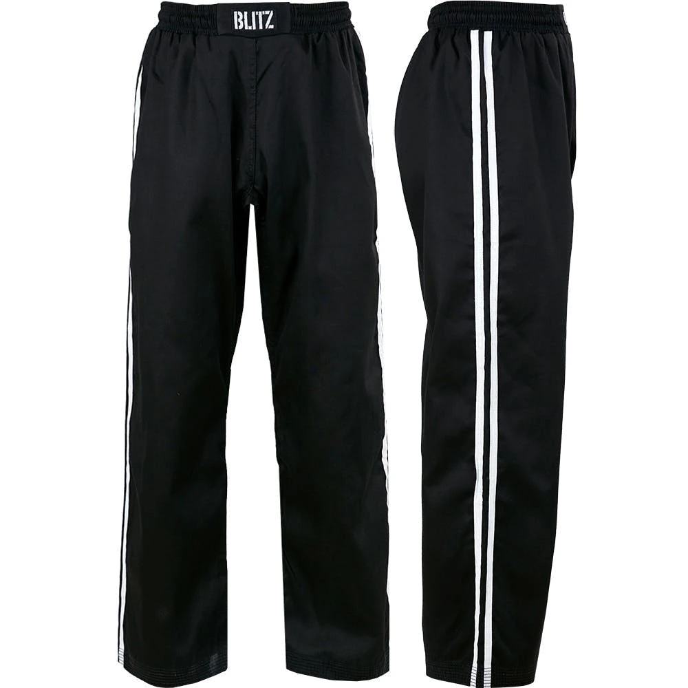 Kalhoty BLITZ FULL CONTACT v černé barvě s kontrastními pruhy na nahovacích. Jsou vyrobeny z 50% bavlny a 50% polyesteru a jsou idealní pro trenink kick boxu i jiných bojových stylů.