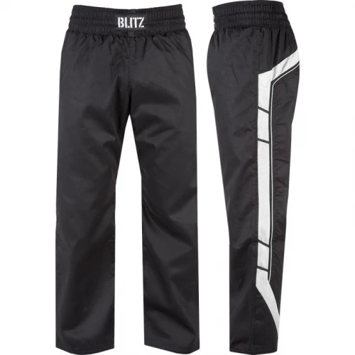 Plátěné kalhoty BLITZ Elite Full Contact - černo/bíléKalhoty BLITZ Elite Full Contact v černo bílé barvě s bílými pruhy na nohavicích. Kalhoty mají vyztužené švy a elastický pas. Jsou vyrobeny z polykottonu a jsou vhodné pro všechny druhy bojových umění.Polyester: 65% Bavlna: 35%BLITZ