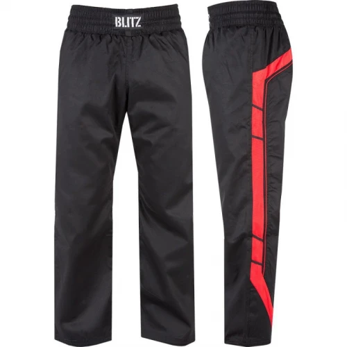 Plátěné kalhoty BLITZ Elite Full Contact - černo/červenéKalhoty BLITZ Elite Full Contact v černo červené barvě s červenými pruhy na nohavicích. Kalhoty mají vyztužené švy a elastický pas. Jsou vyrobeny z polykottonu a jsou vhodné pro všechny druhy bojových umění.Polyester: 65%Bavlna: 35%BLITZ