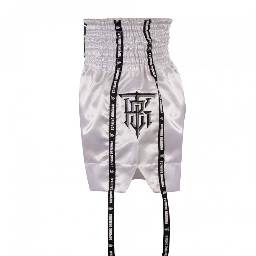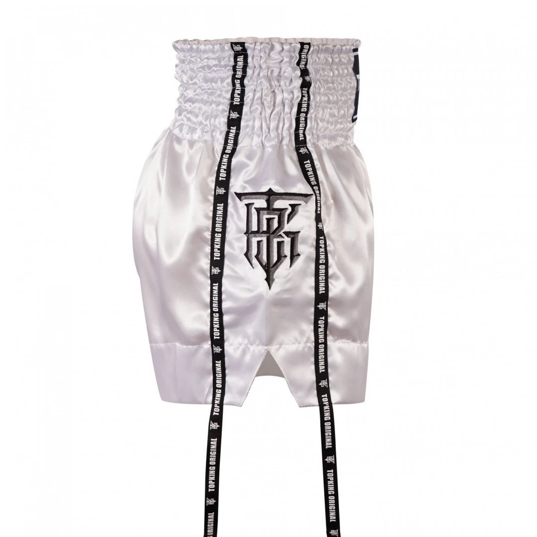 TOP KING trenky na Thajský box TKTBS-201Thajské trenky TOP KING na Muay Thai v bílé barvě. Jednodužší varianta trenek bez větších nášivek model TKTBS-201.  Tradiční vysoká guma v pase a logo na středu trenek. Velice kvalitní satén a střih Thajských trenek, neomezuje během tréninku, nebo zápasu v žádném pohybu nebo kopu. TOP KING je jedna z nejstarších a nejkvalitnějších Thajských firem zabívající se více něž 20. let výrobou rukavic, chráničů, vybavení a trenek pro bojovníky Muay Thai. Vyrobeno v Thajsku.M = 49 - 69 kg | L = 70 - 79 kg | XL = 80-89 kg | XXL = 90-110 kg