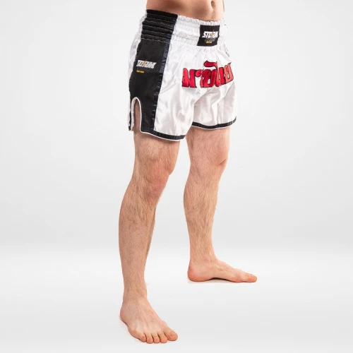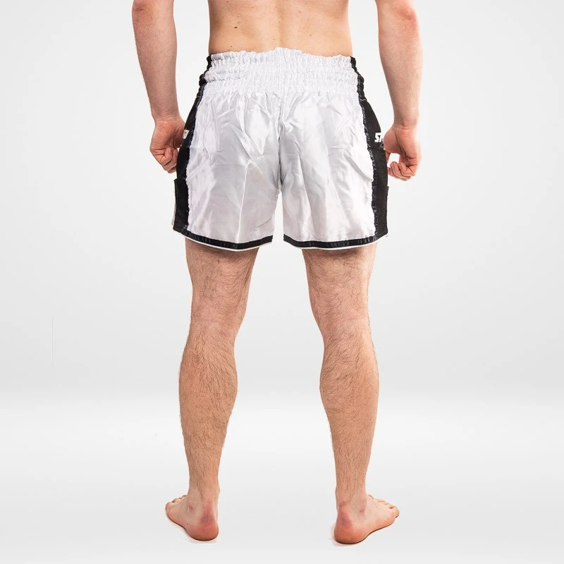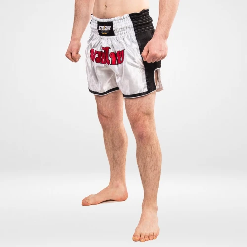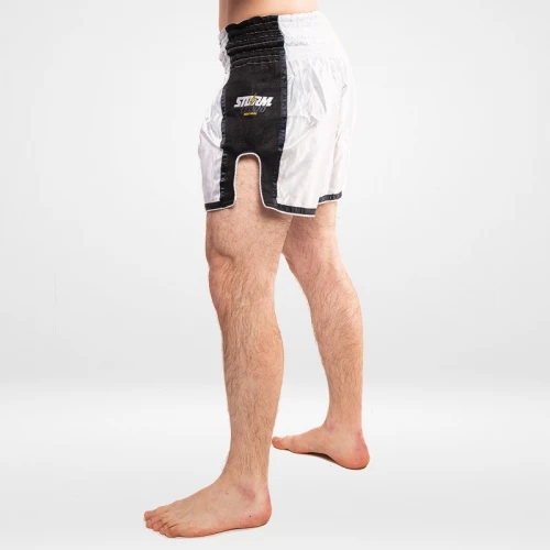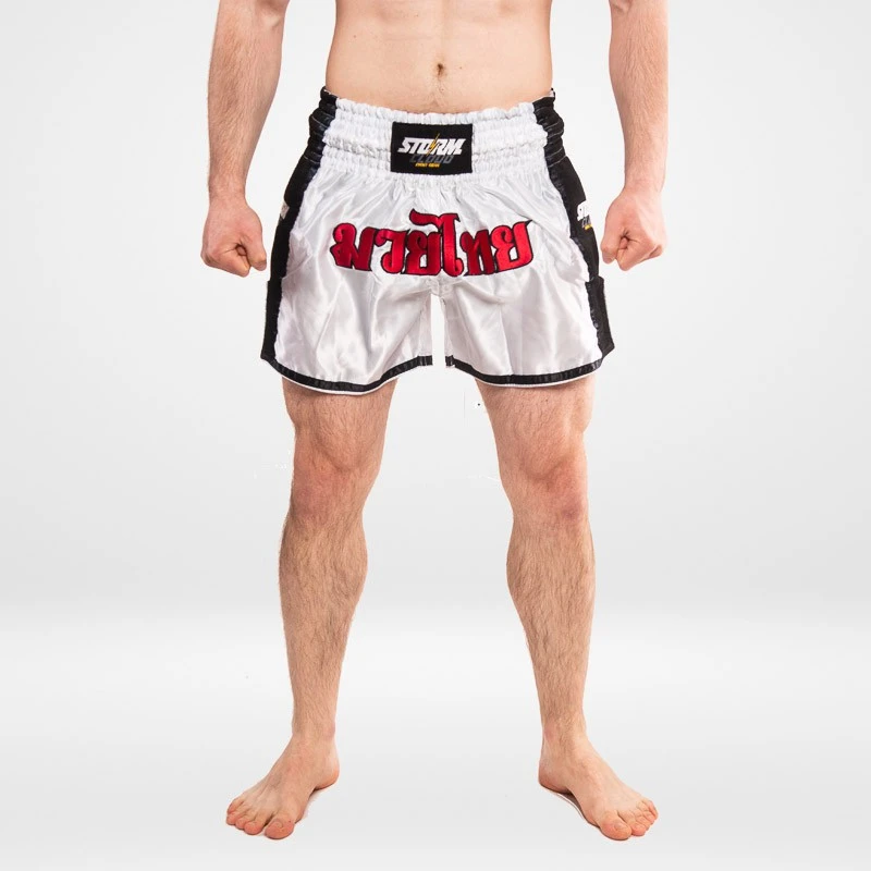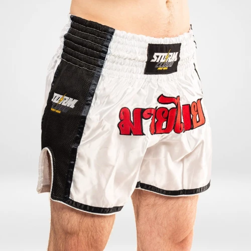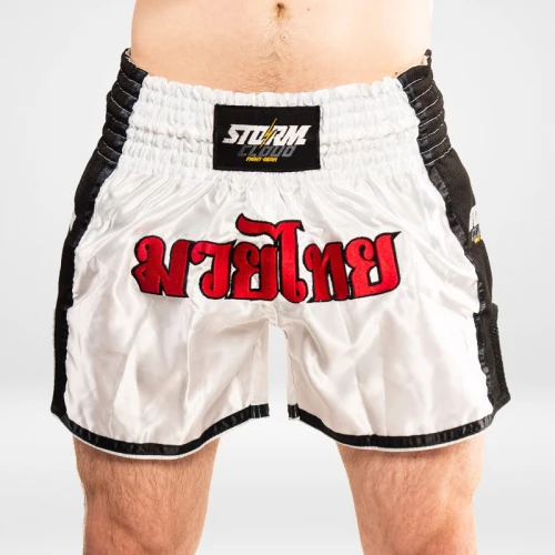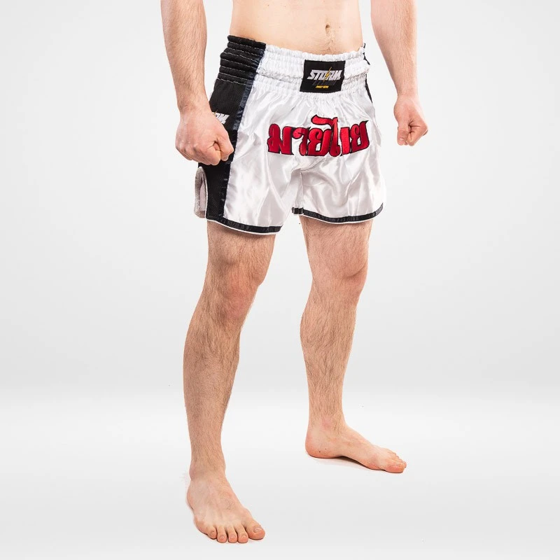 Šortky StormCloud jsou určeny pro trénink thajského boxu a bojových sportů. Krátké výřezy po stranách vám umožní volně kopat. Elastický pas zajišťuje dokonalé padnutí a zabraňuje pohybu šortek. Muay Thai šortky jsou vyrobeny z hladkého saténu a síťovaného materiálu na bocích šortek. Celé to zdobí loga značky StormCloud.