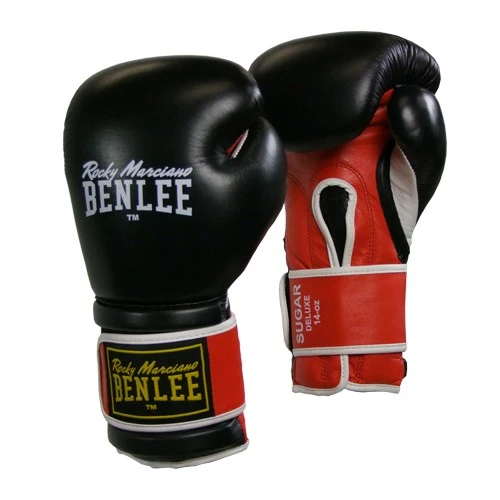 BOXERSKÉ RUKAVICE BENLEE SUGAR DeluxeBOXERSKÉ RUKAVICE BENLEE SUGAR Deluxe v černo červeném provedení s bílým logem BENLEE. Boxerské rukavice jsou vyrobeny z kůže. Rukavice BENLEE jsou na suchý zip. BENLEE