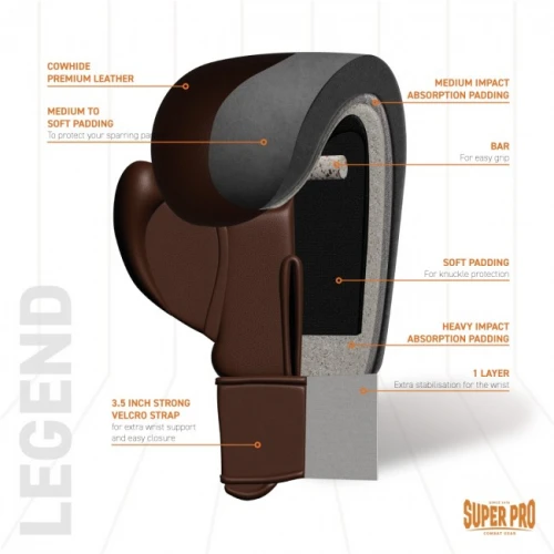 SUPER PRO Boxérské rukavice Combat Gear Legend - hnědéKožené boxerské rukavice v retro stylu SUPER PRO Legend v hnědé barvě. Boxerské rukavice Super Pro jsou vyrobeny z kůže nejvyšší kvality, jsou pružné a velmi odolné. Polstrování je ručně vyrobeno ze složení 4 různých vrstev materiálu, je tedy na rukou příjemné a zároveň poskytuje dokonalou ochranu. Zapínání na suchý zip zajišťuje větší pevnost a pohodlí na zápěstí. Vnitřní strana rukavic je vyrobena z jakéhosi sametu, který je velice příjemný na dotek.SUPER PRO