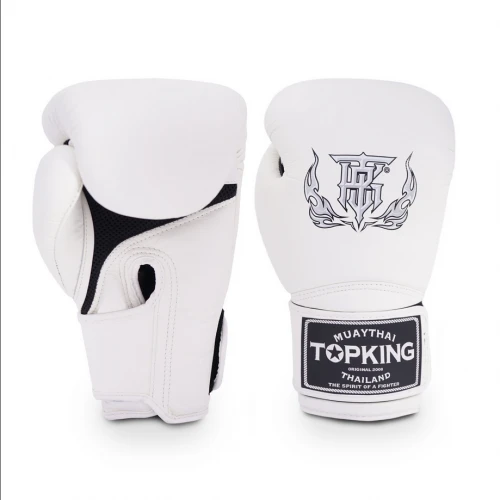 Boxerské rukavice TOP KING Super Air Single Tone - BíléLegendární Thajské rukavice Top King s novým logem v celokožené verzi můžeme doporučit pro všechny kontaktní sporty, a to jak pro trénink na pytli, sparring nebo cvičení na lapách. Rukavice Top King jsou vyrobeny jenom z té nejlepší výběrové kůže. Uvnitř rukavic Top King naleznete několik vrstev PUR a latexových pěn. Vrstvy jsou poskládány tak, aby chránily především oblast kloubů a další části ruky náchylné ke zranění. Palec rukavice je přichycen k rukavici. Ve spodní části rukavice je prodyšný mesh materiál, který odvětrává teplo a vlhkosti z rukavic. Značka Top King patří k tradičním Thajským značkám, které jsou na trhu již desítky let což zajišťuje ty nejlepší výrobky pro bojové sporty. Široké zapínání na suchý skvěle zpevňuje zápěstí.