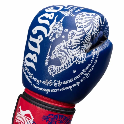 PHANTOM Boxerské rukavice Muay Thai - modré Nové boxerské rukavice Phantom model Muay Thai. Boxerské rukavice Muay Thai jsou vyrobeny z kvalitního materiálu s detailním prošitím. Vnitřek boxerských rukavic Phantom Muay Thai je vyroben z materiálu MESH. Zvláštností je provedení ve stylu thajských tetování Sak-Yant/Yantra s tygry a thajskými znaky. Navíc propracované detaily, jako jsou barevné švy a jemná loga. Podrobnosti: - Muay Thai design- High-tech pěnové polstrování- Kompaktní provedení- Stabilní zápěstí- Polstrování na dlaních pro blokování úderů a kopů- Dodatečné větrání na dlani- Materiál: PU- Mají pevné vycpávky pro údery a blokující kopy a také typický střih rukavic pro thajský box. PHANTOM