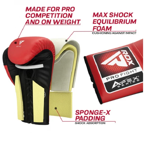 Profesionální šněrovací rukavice RDX APEX A3 Competition - červenéProfesionální kožené šněrovací rukavice RDX APEX A3 Competition v červené barvě. Rukavice jsou ideální variantou pro soutěžní zápasy. Tyto boxerské rukavice RDX Apex jsou vše, co potřebujete, abyste se dostali přes vaše soupeře. Vyrobeno z pravé kůže Super Skin pro dlouhotrvající odolnost, která chrání ruce před otřesy. Vycpávka Sponge X s vrstvou Equilibrium Foam zajišťuje maximální ochranu a zároveň umožňuje jen tolik zpětné vazby kloubů, aby bylo možné změřit vaši sílu při každém úderu. -Super Skin Combat kůže je dlouhotrvající a odolná proti opotřebení -Výplň Sponge X poskytuje pevnou stěnu tlumení proti nárazu s vrstvou pěny Max Shock Equilibrium, která ji podpoří. -Připojený palec je vyplněn výplní SpongeX, která absorbuje nárazy. -Šněrování je vyrobeno z nylonového vlákna s mírně krátkou manžetou pro ochranu a vyrovnání zápěstí pro bezpečnější držení ruky. -Vyrobeno pro profesionální soutěže s přesnou váhou.