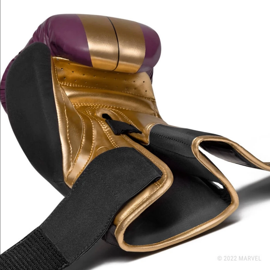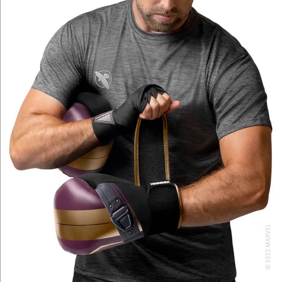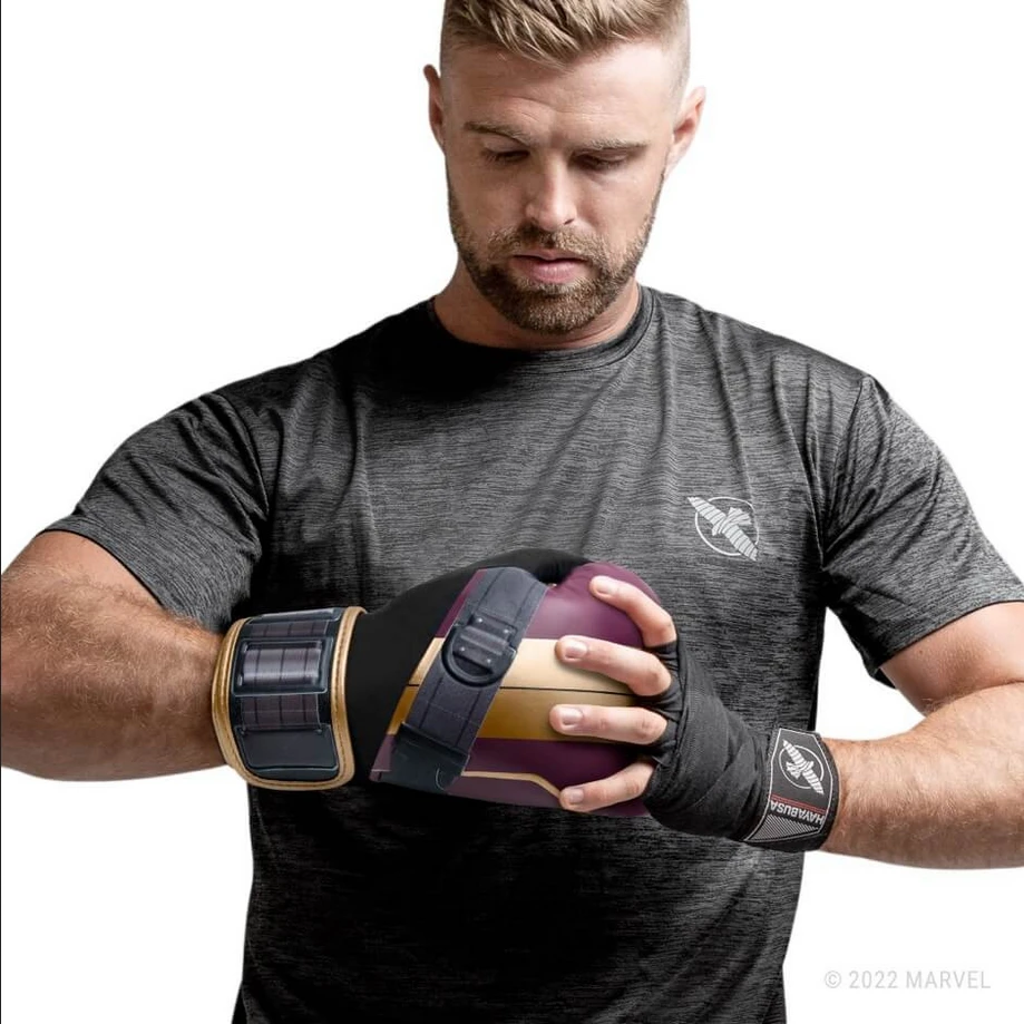HAYABAUSA MARVEL Boxerské rukavice Batroc Představujeme vám Boxerské rukavice Hayabusa MARVEL! Neúprosný padouch a legendární kickboxer Georges Batroc je zdatný zloděj s pochybnou ctí, což z něj dělá ideálního žoldáka pro temné činy. Tyto rukavice jsou inspirovány Batrocovou militaristickou výstrojí a ztělesňují jeho taktickou uniformu, od užitkové vesty a popruhů až po jeho ikonické fialové a zlaté barevné schéma. Rukavice jsou vyrobeny z prvotřídní kůže Vylar té nejlepší kvality.Vlastnosti produktu:- Vlastní design Batroc se složitými detaily postavy.- Zápěstní pásky Dual-X se vzájemně prolínají a zajišťují pohodlné a přesné uchycení.- Vícevrstvá technologie pěnového složení dodává maximální ochranu kloubů.- Palec z mikrovlákna umožňuje otírání potu.- Mimořádně měkká podšívka regulující teplotu udržuje ruce v chladu.- Certifikát pravosti Hayabusa X Marvel.HAYABAUSA