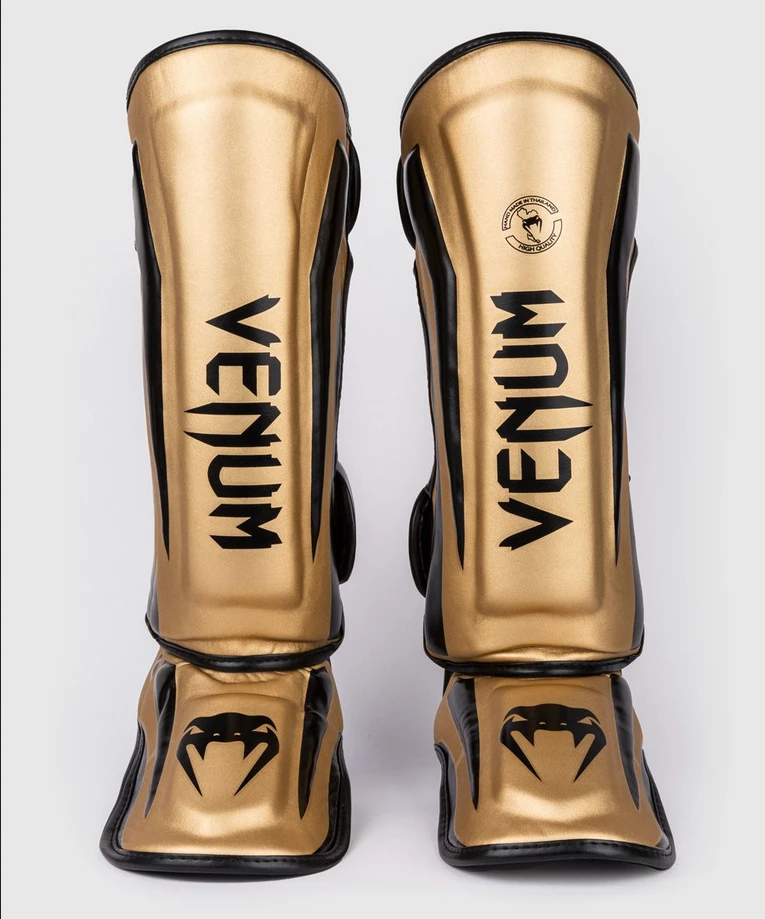 Chrániče holení VENUM ELITE - zlato/černéChrániče holení Venum Elite Evo jsou pokračováním úspěšné řady Venum Elite. Vylepšené chrániče holení a nártů na bojové sporty VENUM ELITE jsou potaženy mikrovláknem (vyrobeným v Japonsku), které je mimořádně odolné a spolu s precizním zpracováním zaručí dlouhou životnost. Chrániče Elite jsou velmi lehké. Ergonomické a drží pevně na noze. Ideální pro Muay Thai, Kick Boxing nebo MMA.- Potah z mikrovlákna (vyrobeno v Japonsku)- Pěna o více hustotách s výztuhou na hřebeni holenní kosti a nártu- Dva široké suché zipy- Dva velké elastické podpůrné pásky: jeden pod chodidlem, druhý za patou- Anatomický design - maximální pohyblivost- Ruční výroba v Thajsku.VENUM