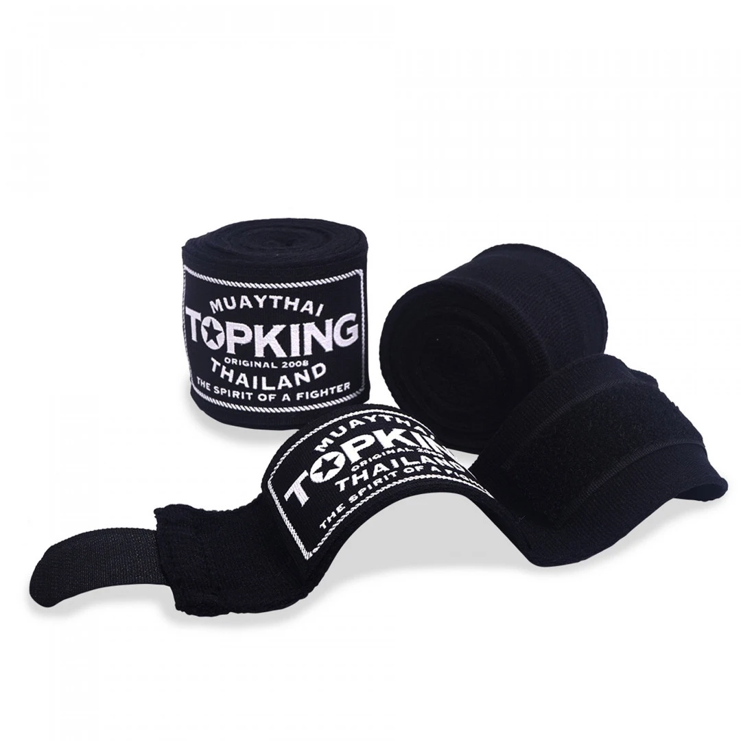 Bandáže TOP KING v černé barvě jsou vyrobeny ze 100% polo-elastické bavlny. TOP KING BOXING bandáže na ruce pro box, Muay Thai, Kickbox, MMA a další. Bandáže od legendární Thajské značky pro nejlepší ochranu rukou. Perfektní zpevnění mezi prsty a klouby. Bandáže TOP KING jsou dlouhé 4,5 m.Vyrobeno v Thajsku.