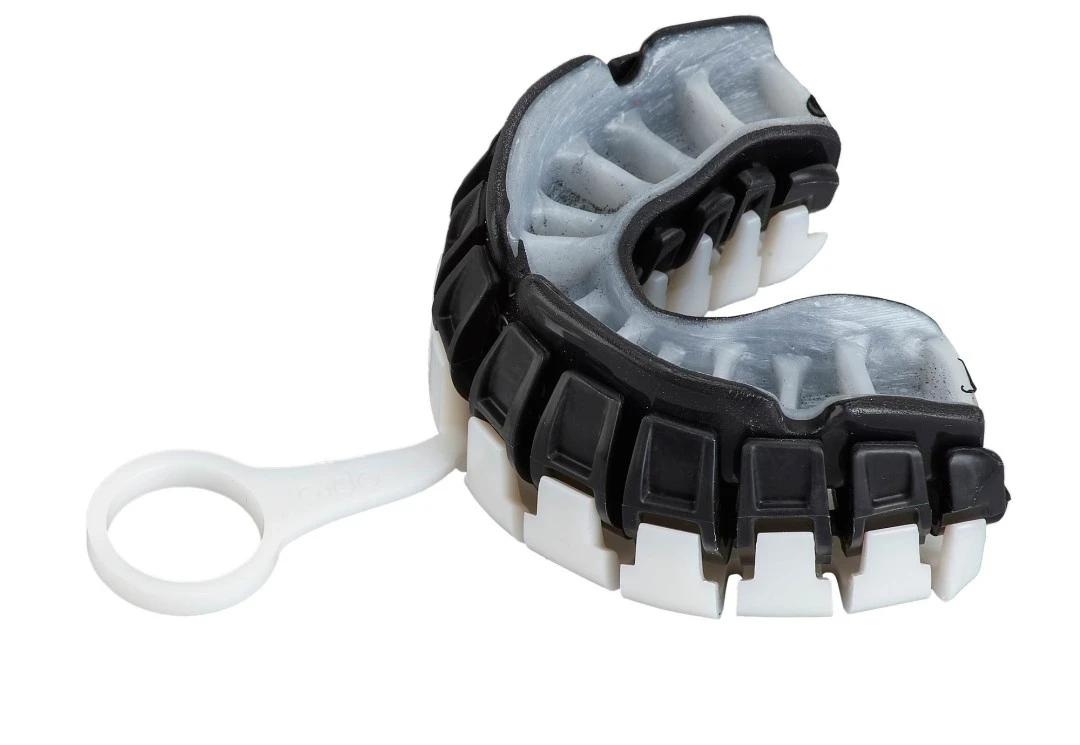 Vnitřní část chrániče nabízí patentovanou technologii žáber, které po vytvarování přesně vyplní mezery mezi Vašimi zuby a poskytují tak maximální ochranu.