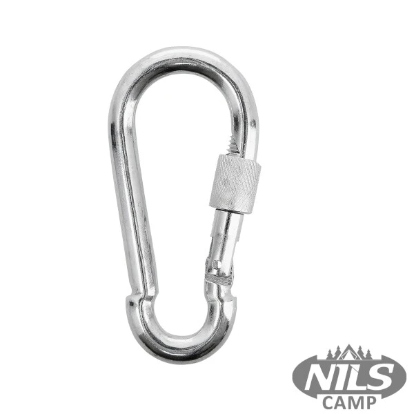 Ocelová karabina NILS Camp NB5042 s šroubovací pojistkou váží pouhých 9 gramů, při zamknuté pojistce má ale nosnost až 500 kilogramů.